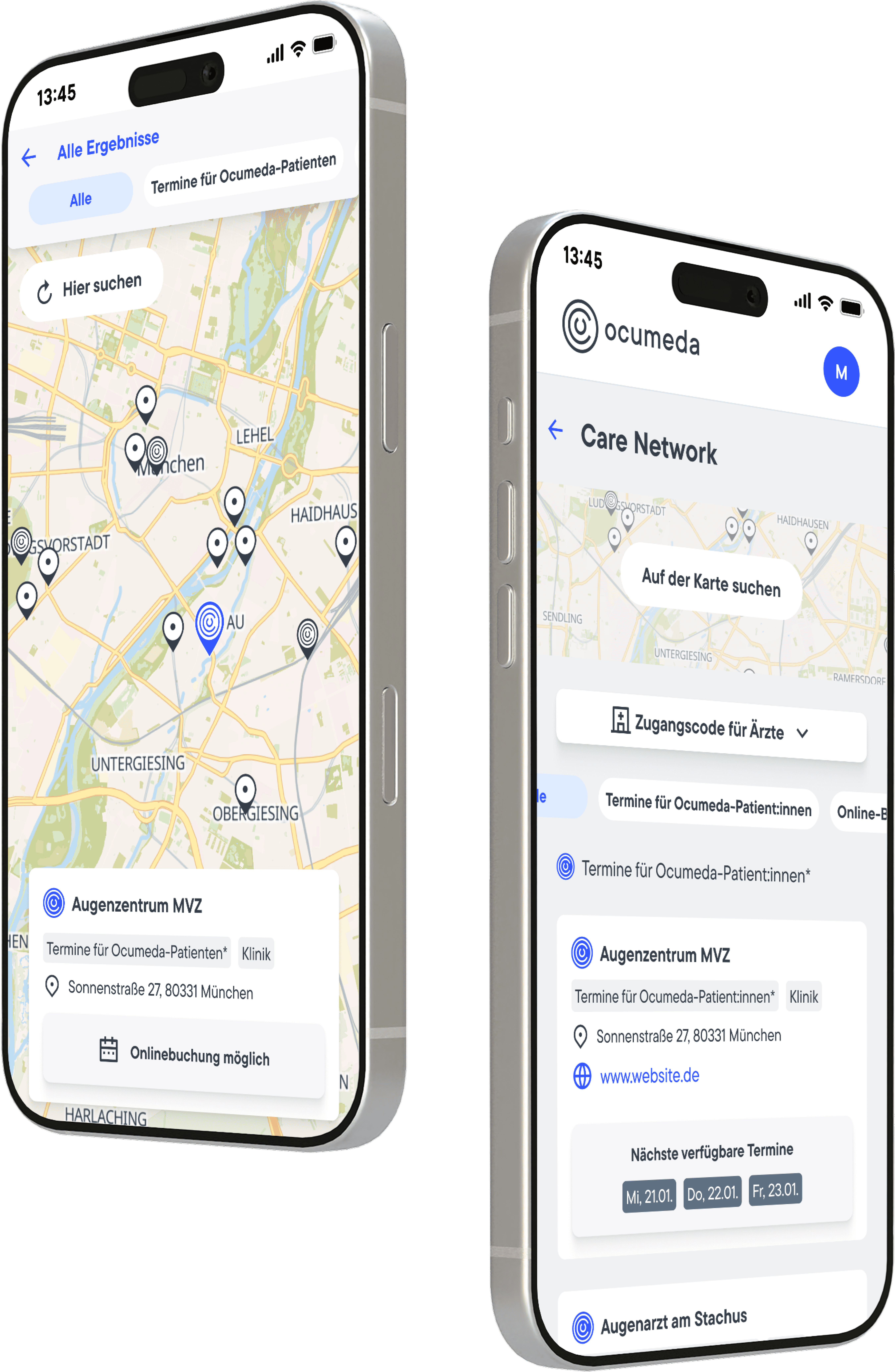 Teilnehmende des Augen-Check-Ups erhalten eine strukturierte Übersicht regionaler Augenarztpraxen, nach Entfernung sortiert. Praxen mit verfügbaren Terminen werden bevorzugt angezeigt, sodass Menschen mit Abklärungsbedarf schnell einen Termin finden können.